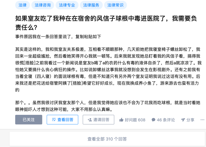 另外,案例中室友误食风信子中毒,风信子主人如果构成侵权责任的话,只能是不作为的侵权责任,如果是行为人主动喂食追求让他人中毒的效果,则可能涉嫌故意杀人罪(刑事责任)。“不作为的侵权行为”作为一种特殊的侵权行为,需要具备四个要素:1、有作为的义务。2、有作为的能力。3、有结果回避的可能性。4、未履行义务。其中“作为义务”的来源又主要有三点:1、法定的义务(如宾馆、酒店等经营者具有安全保障义务);2、约定的义务(托儿所基于合同约定有义务保障幼儿健康、人身安全);3、先行行为(如组织驴友去深山老林,导致驴友发生危险而不救助)。
