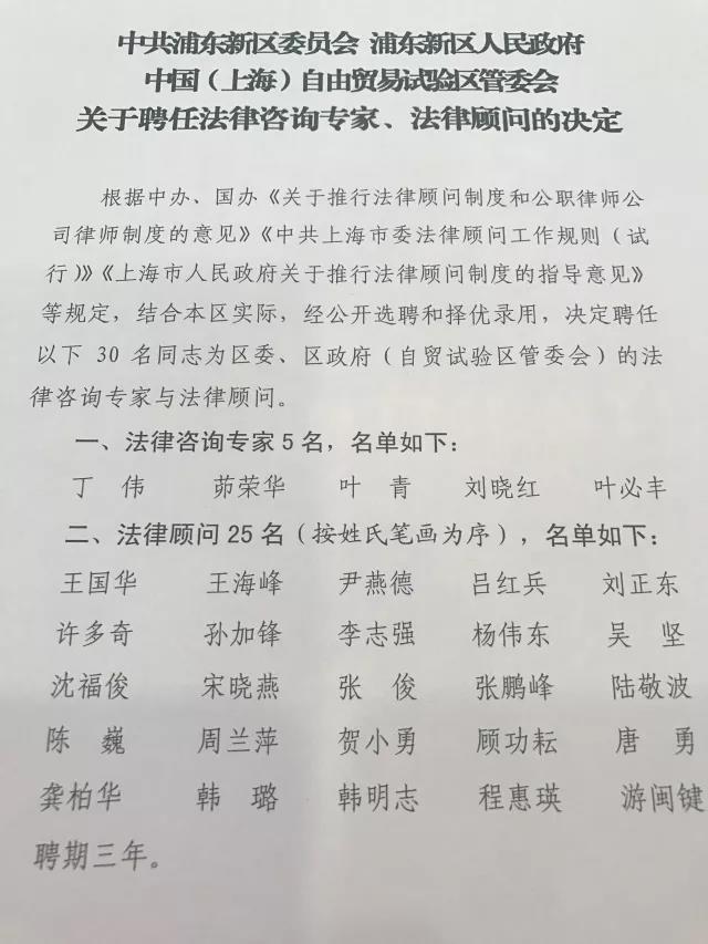 2018年6月22日,中共上海市浦东新区委员会、浦东新区人民政府和中国(上海)自由贸易试验区管委会举行法律顾问聘任仪式,市委常务、浦东新区区委书记、中国(上海)自由贸易试验区管委会主任翁祖亮、上海市人民政府副秘书长、浦东新区区委副书记及区长、中国(上海)自由贸易试验区管委会常务副主任杭迎伟、浦东新区区委副书记冯伟、区委常委及副区长、中国(上海)自由贸易试验区管委会副主任陆方舟和浦东新区区委常委、区政法委书记李泽龙等领导为丁伟、茆荣华、叶青、刘晓红、叶必丰等5名法律咨询专家和顾功耘、沈福俊、刘正东、龚柏华、李志强等25名法律顾问颁发聘书。