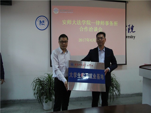 2017年4月26日下午,上海金茂凯德(芜湖)律师事务所应安徽师范大学法学院邀请,参加了安师大法学院在院行政楼四楼会议室举办的“安师大法学院——律师事务所合作洽谈会”。会议期间,上海金茂凯德(芜湖)律师事务所与安师大法学院在签订《共建实习就业基地协议书》的基础上,达成法学院毕业生律所实习、律所选派资深律师作为就业创业导师等多项共识。安师大法学院党委书记马广见代表安师大法学院向上海金茂凯德(芜湖)律师事务所管委会执行主任李天亮授牌“安徽师范大学法学院大学生实习就业基地”,并向上海金茂凯德(芜湖)律师事务所创始合伙人朱光忠主任颁发了大学生就业创业导师聘书。这标志着上海金茂凯德(芜湖)律师事务所与安师大法学院在大学生就业实习领域的合作拉开序幕。
