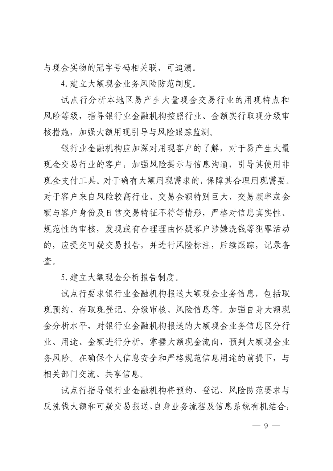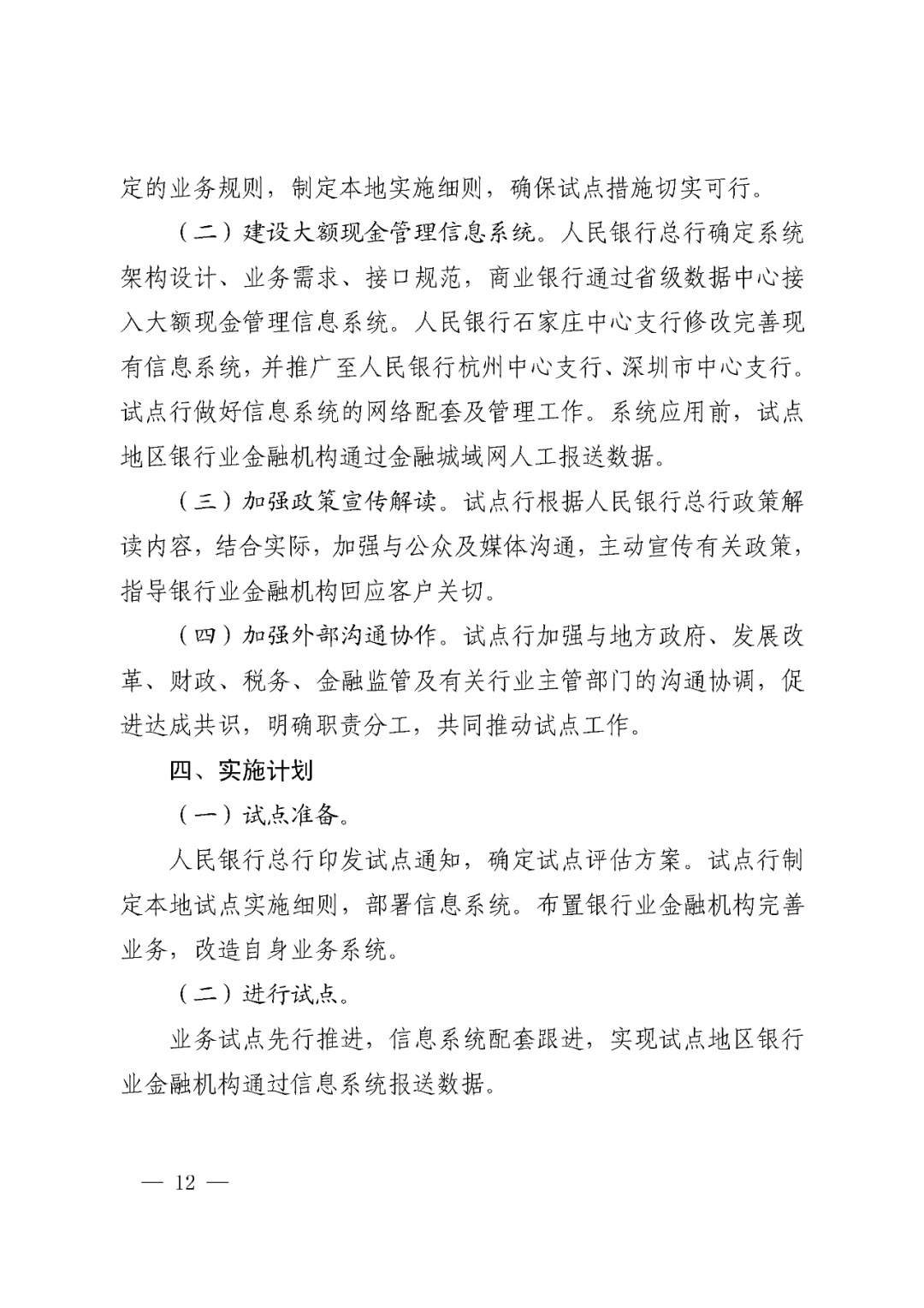 按照国务院要求,央行研究了加强我国大额现金管理的具体措施。我国各地经济金融情况各异,部分地区先行先试是当前形势下推进大额现金管理的有效路径,有助于在控制风险的前提下验证最佳的操作层面方案,逐步推广合理用现理念,为建立大额现金管理长效机制奠定基础。