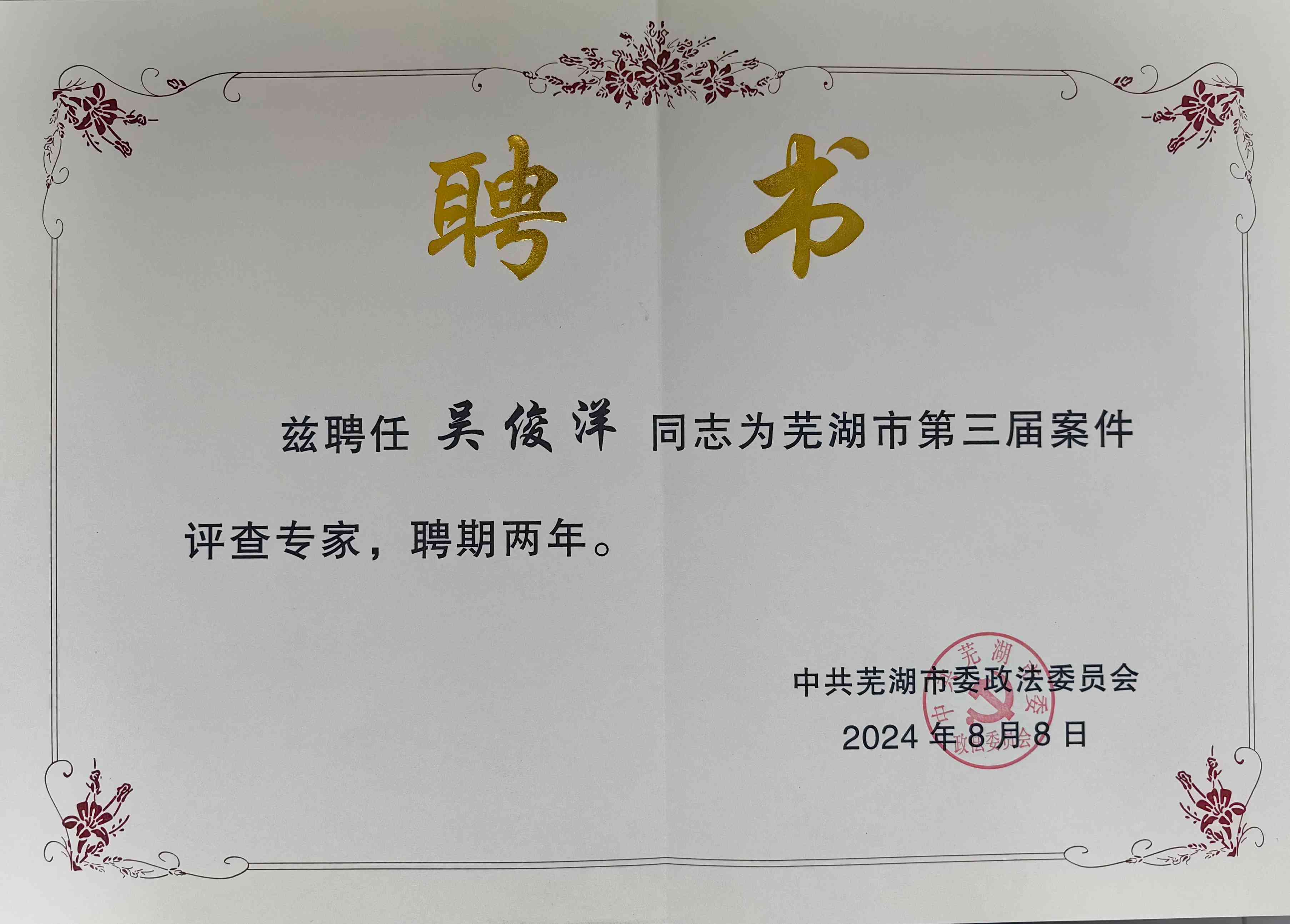 我所主任吴俊洋律师受聘担任芜湖市镜湖区